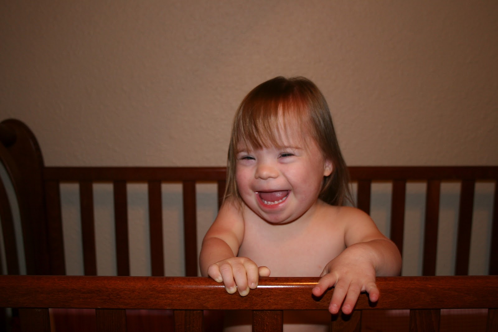 One of the more significant delays of peeps with Down syndrome is speech. It is not that my daughter doesn’t understand almost everything you say, she just lacks the muscle tone in their mouth and core to form the words to speak back to me. It is something we work with her on during her speech therapy sessions and all the time, really. She can, however, speak to us…with her hands...and she does so constantly. We are teaching her sign language and she learns about three new words each week. One of her newest and coolest things she ‘says’ to me every morning when I go to get her out of bed….