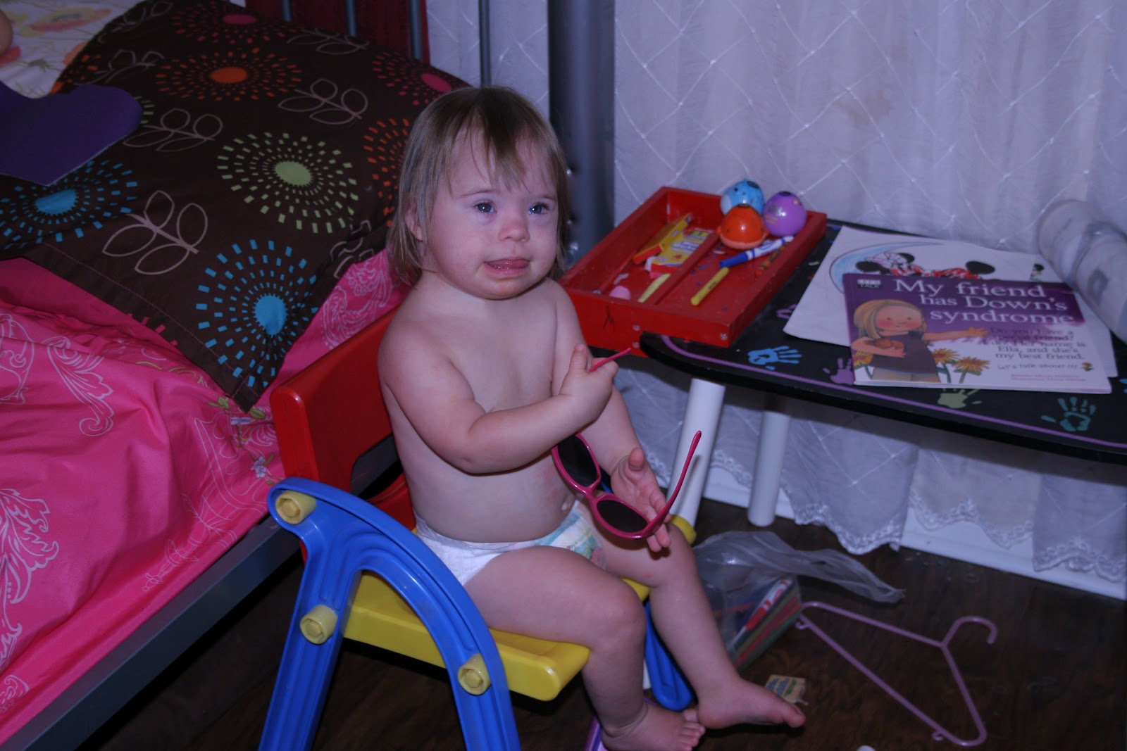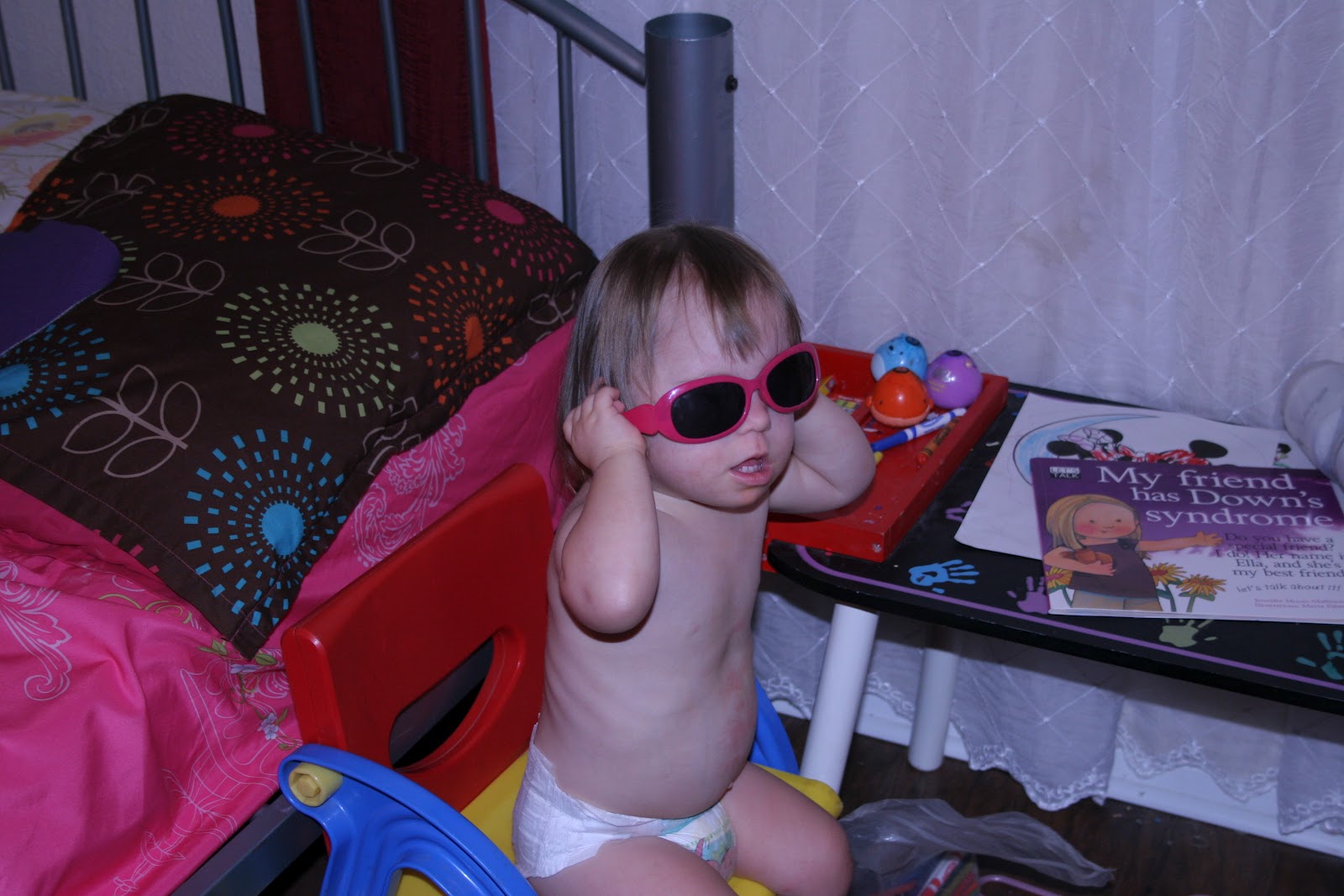 It seems like a small thing…but she totally got up into this chair by herself…her feet don’t even touch the floor when she is sitting in it…and of course she had to look cool doing it with the shades and all!! She has been wanting to climb things like crazy…so we have been creating obstacle courses for her all over the house. This one is a thrill seeker just like her sis…flinging herself all over the place. I imagine them deciding to skydive for graduation together or hike Mt Kilimanjaro for a 21st birthday or something (I think I just grew a new grey hair)..but for now…I have them contained…